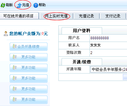 三、进入在线支付模块后,点击“充值”按纽,或者“网上实时充值”标签进入支付页面