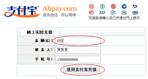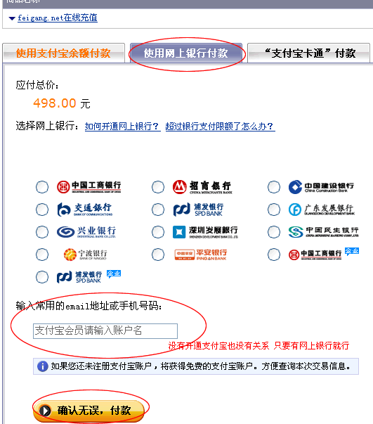 五、选择“使用网上银行付款标签”,选择付款的银行,在第二个红圈处输入您的手机号(没有开通支付宝的输入手机号或者email,已开通的输入支付宝帐号),点击进入付款界面,按提示进行充值。