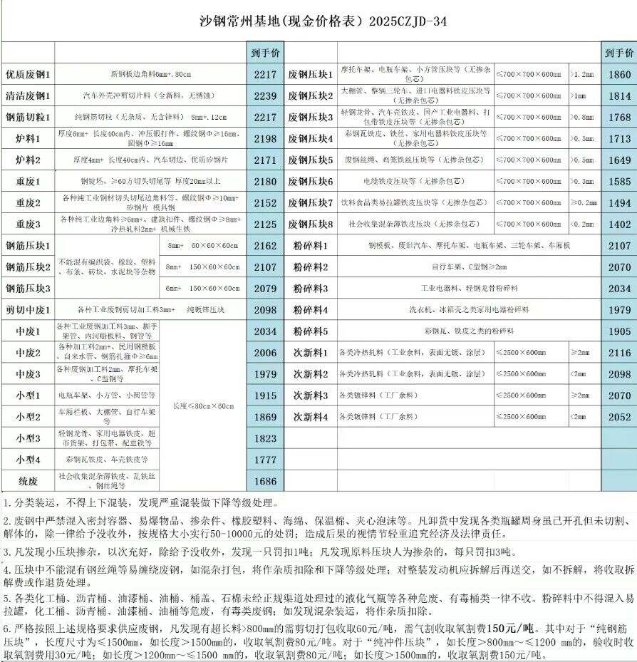 各废钢供货单位:常州沙钢基地自2025年12月11日起废钢含税价下调30元/吨,具体废钢价格以基地价格表价格为准。