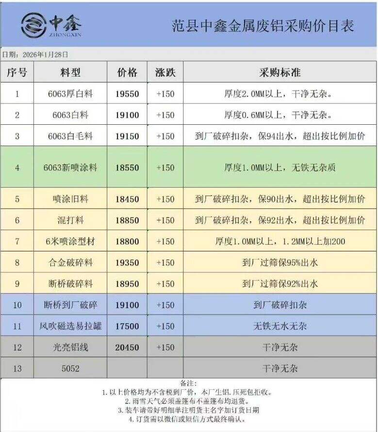 2026年1月28日河南范县中鑫金属废铝采购价目表