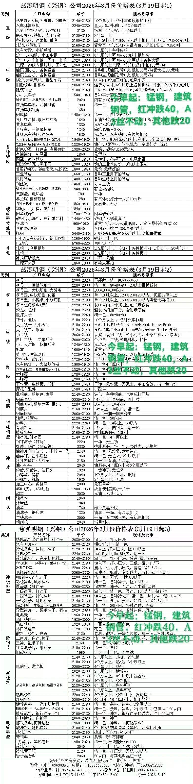 2026年3月19日宁波兴钢最新废钢价格
