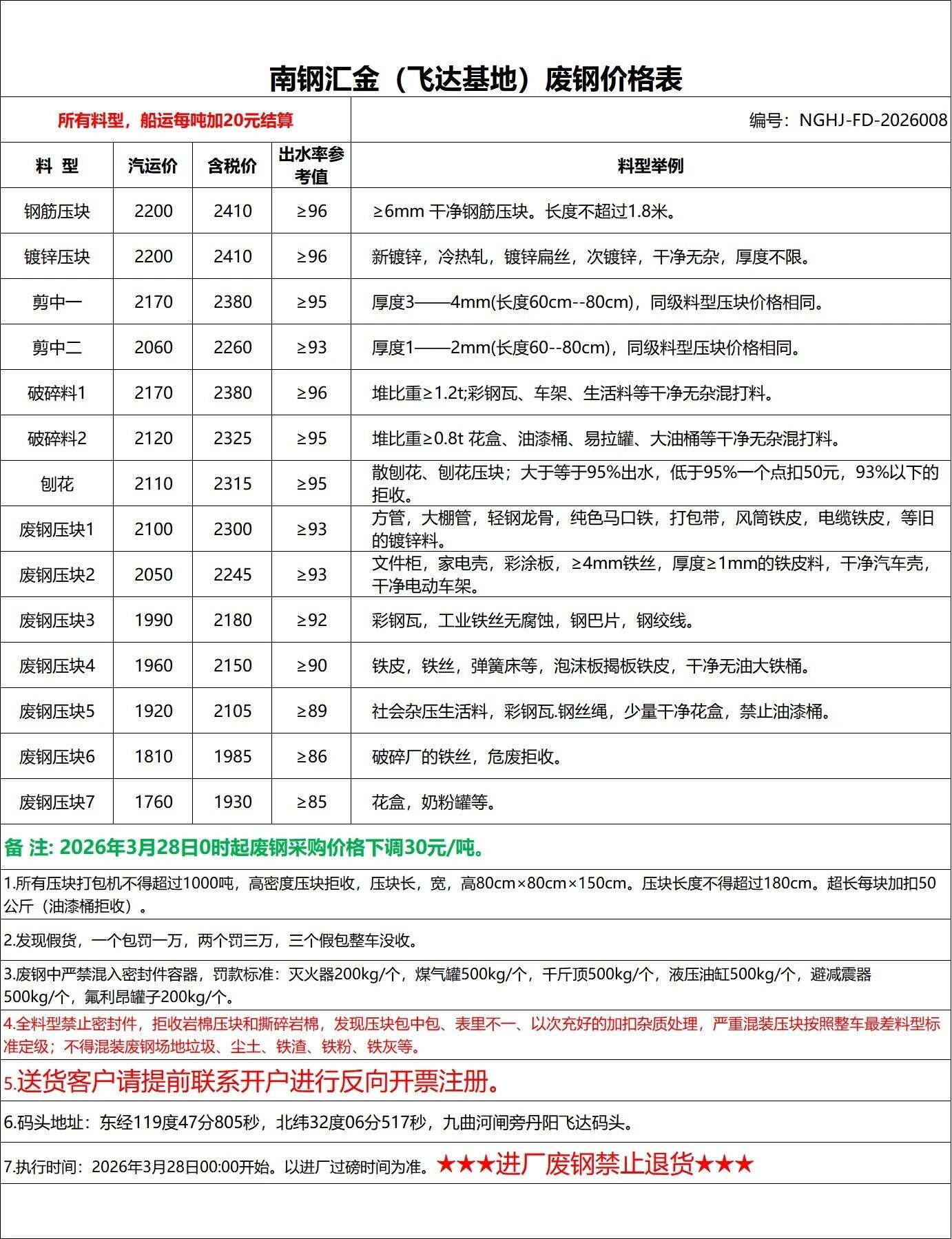 2026年3月27日南钢汇金(飞达基地)废钢价格表