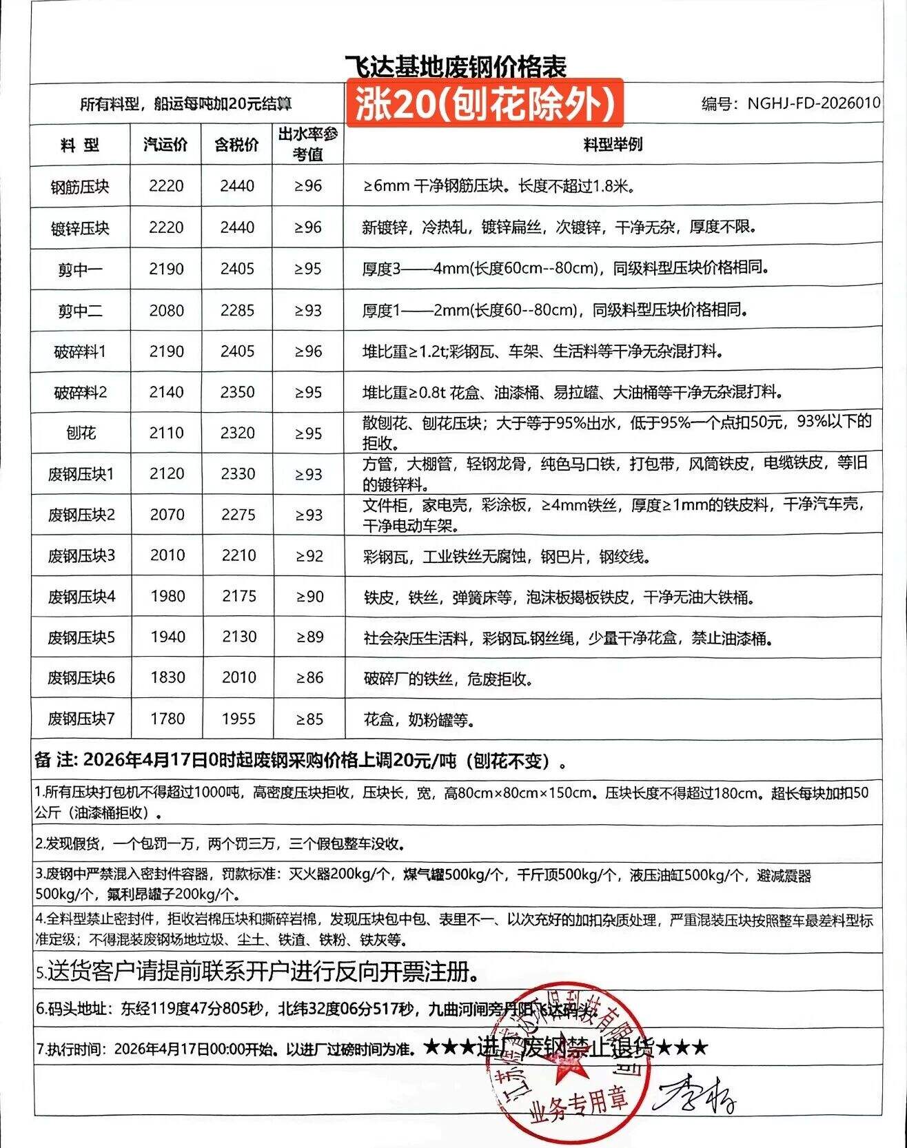 2026年4月17日江苏飞达基地废钢价格部分上调