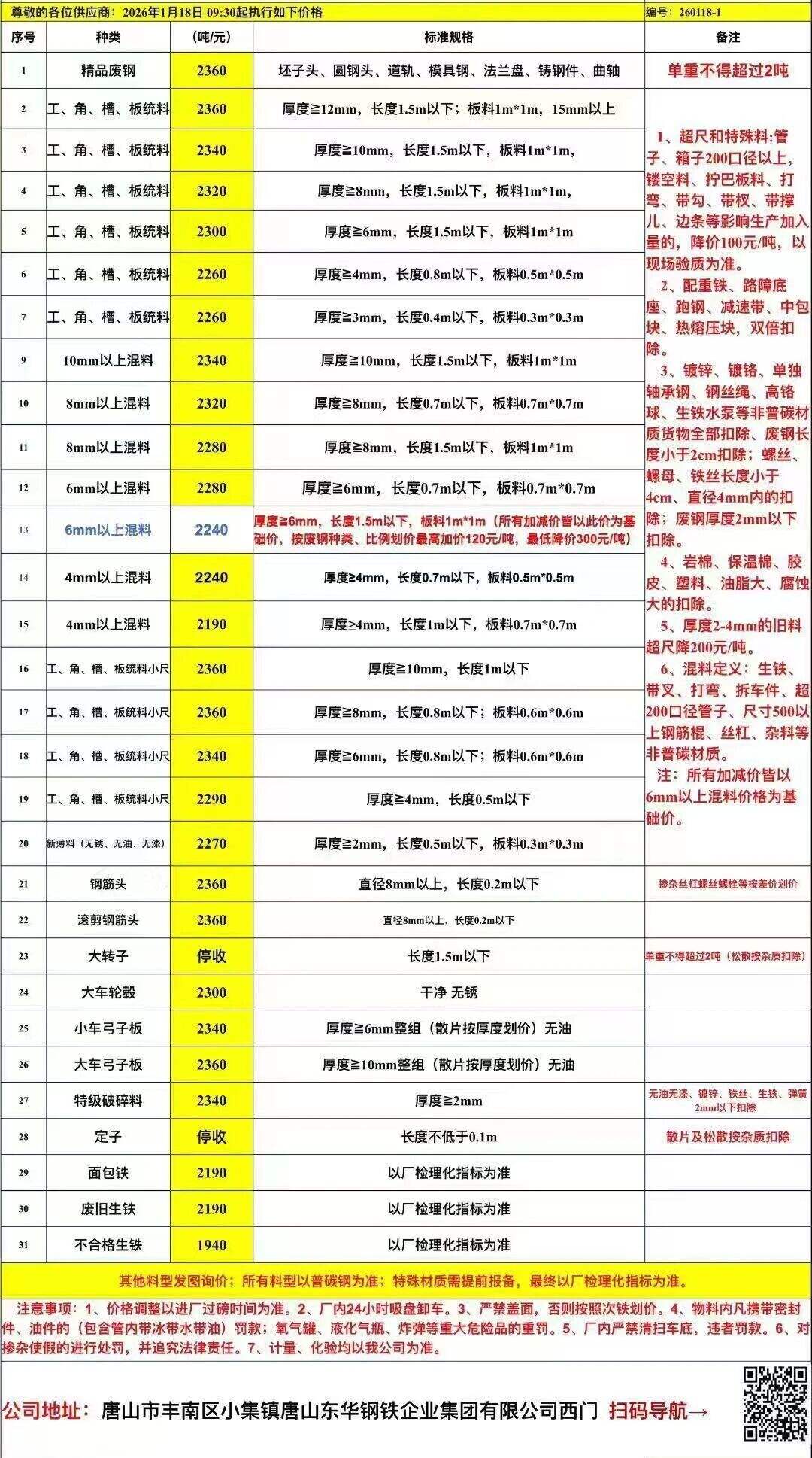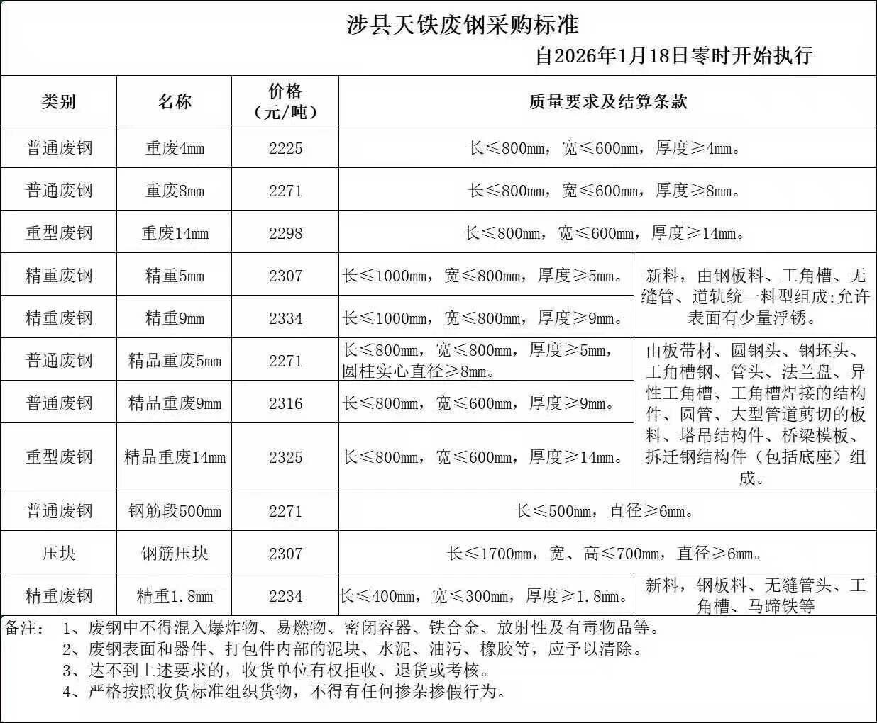 满价****,**厚以上新板料(*.*-*.*m)****、冲豆≥*mm以上、道轨、钢筋切粒****,钢筋头****,**mm以上重废****,*-*小冲豆(无油无锈无氧化铁)****滚剪钢筋头****手撕钢筋头****,大车弓子板****,厚马蹄铁*-*mm****