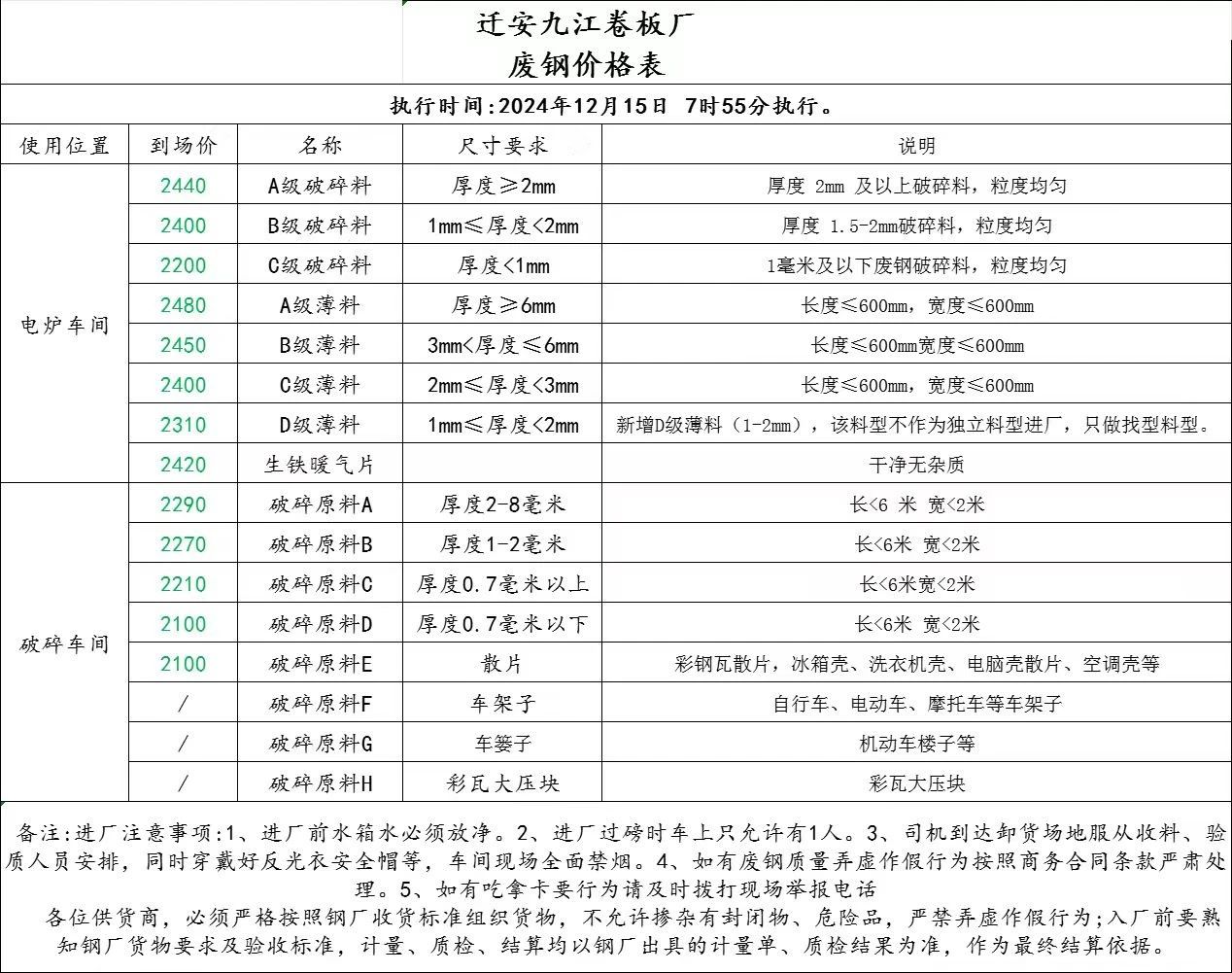 通知!吉林建龙**月**日零时各料型下调**元,①,**mm以上,****元,尺寸***-***熟铁钢件,②,*mm以上,****元,尺寸***-***熟铁钢件,③,*-*mm,****元,尺寸***/***,可生熟混装、机体、变速厢,油放净!,④,钢筋段,****元,尺寸**公分、*个粗以上!,⑤,轨道钢,****元,尺寸不限、**以上纯净道轨!,扣杂标准,*-*mm,*.*%起,*mm、**mm,*.*%起,钢筋段,*.**%起,轨道钢,*杂质禁止装铸铁下水管、井盖、闸瓦、锅铁、渣土、夹心管、密封物横向切开(打孔不行)!注意质量!