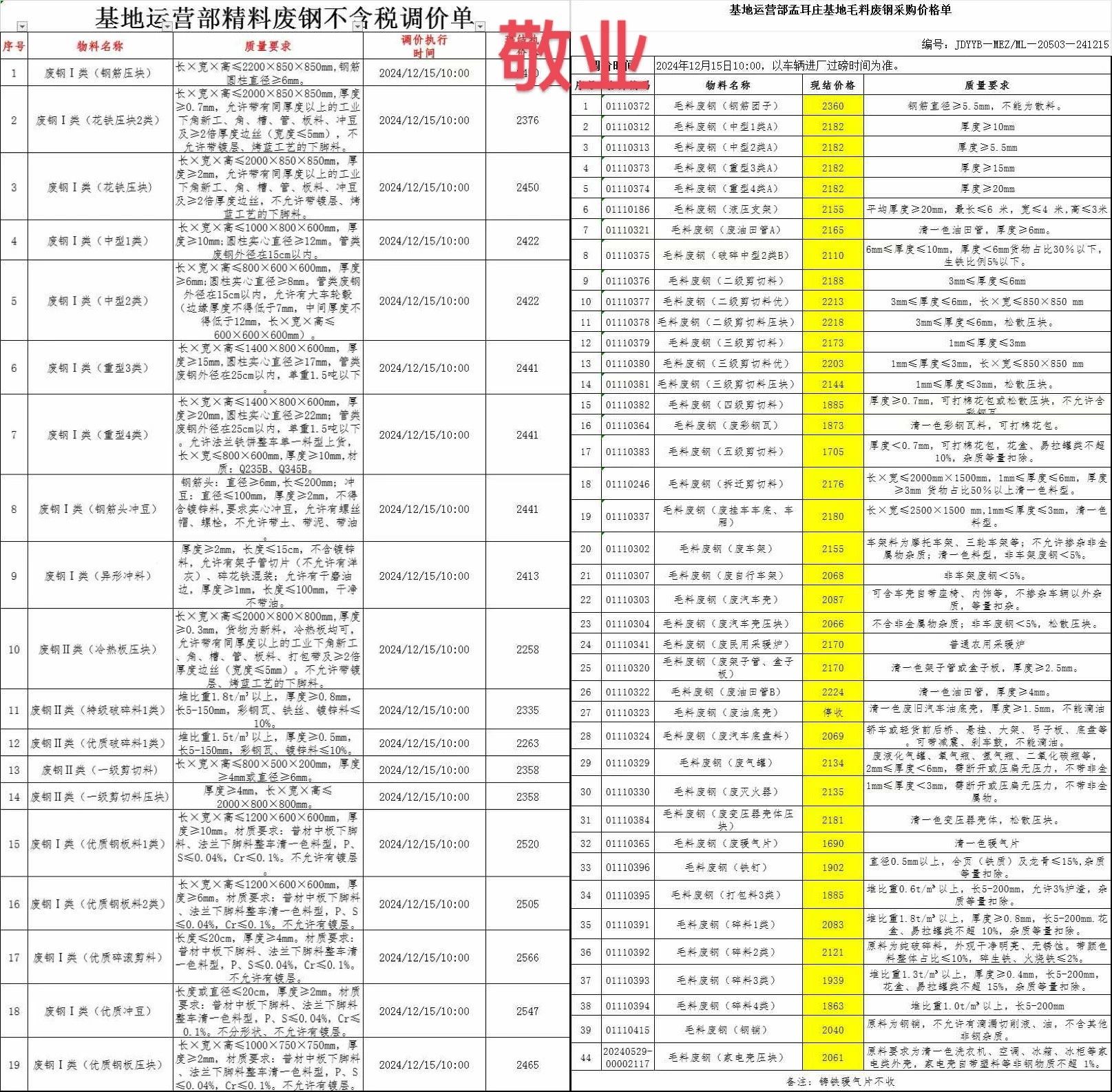 敬业通知,**月**日**点起本部废钢价格调整,具体详见价格表