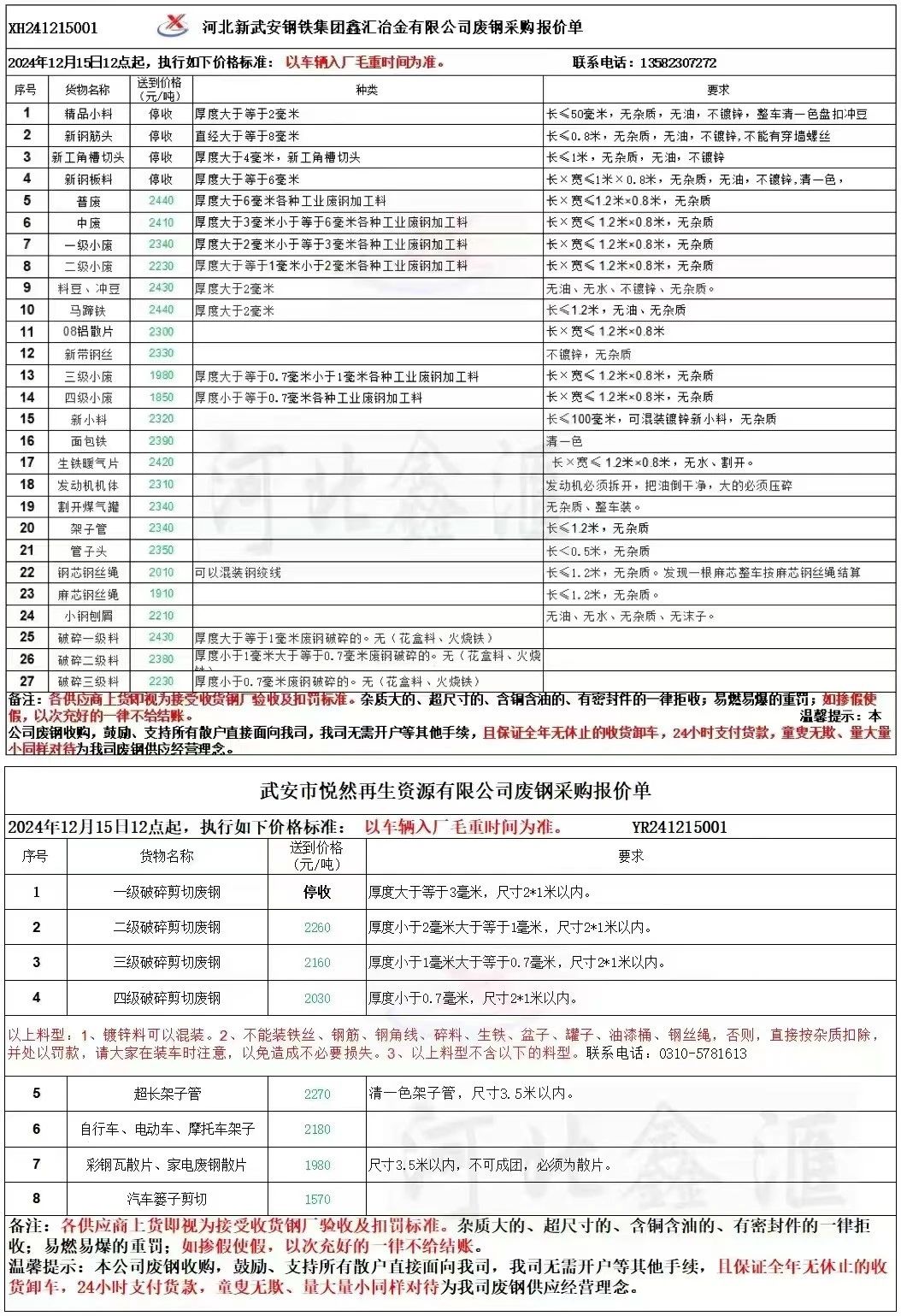 自****年**月**日**点起,鑫汇、悦然所有料型价格下调**元,以过磅毛重时间为准**日鑫汇悦然车间,一级破碎剪切废钢停收,二级破碎剪切废钢****,三级破碎剪切废钢****,四级破碎剪切废钢****超长架子管****,自行车、电动车、摩托车架子****,彩钢瓦散片、家电废钢散片****,汽车篓子剪切****