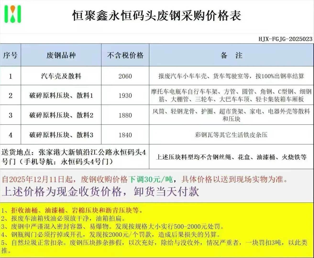 自****年**月**日张家港永恒码头废钢采购价格下调**元/吨。具体以送到现场实物为准,详见最新价格表。送货联系王经理,电话***********。