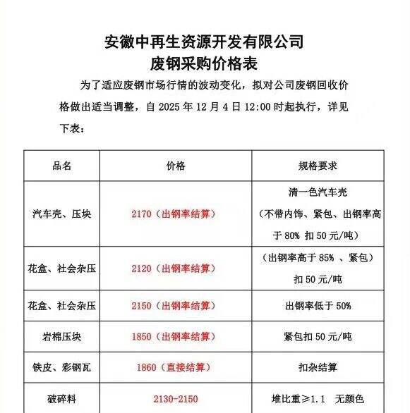 **月*日安徽中再生资源开发有限公司废钢采购价格表