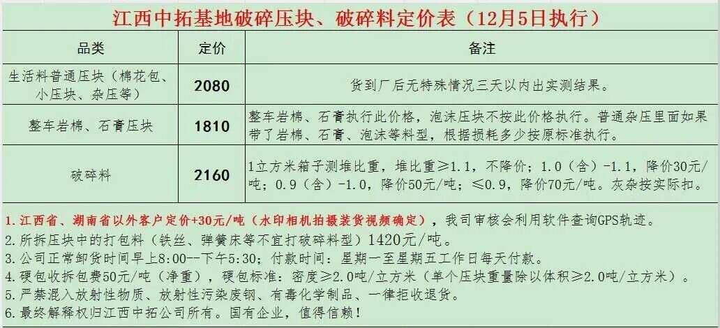 **月*日,江西中拓基地破碎压块和破碎料涨**元/吨。