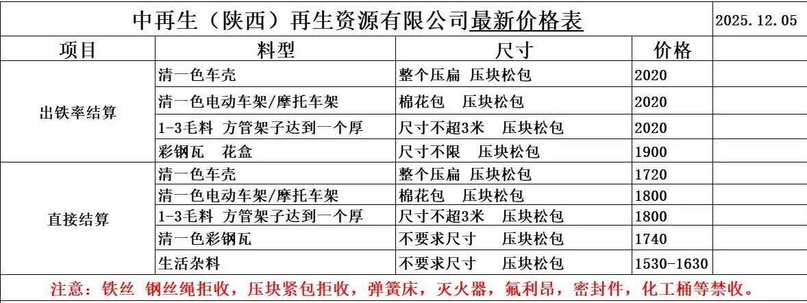 **月*日中再生(陕西)再生资源有限公司最新价格表