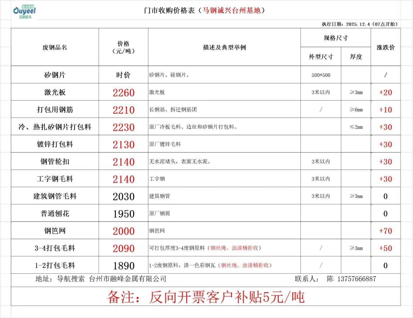 南通九圩港天泽码头现款收:*以上新钢板炉料****、毛料****-****;重废、工角槽****-****;**上直钢筋****;桥梁模板、拆船毛料****-****左右;*以上激光板****;彩钢瓦****-****;气割料、大件生熟铁看货定价。密封容器.含油废钢拒收。可带票,价格另议。联系电话*********** 入场人员请佩戴安全帽!