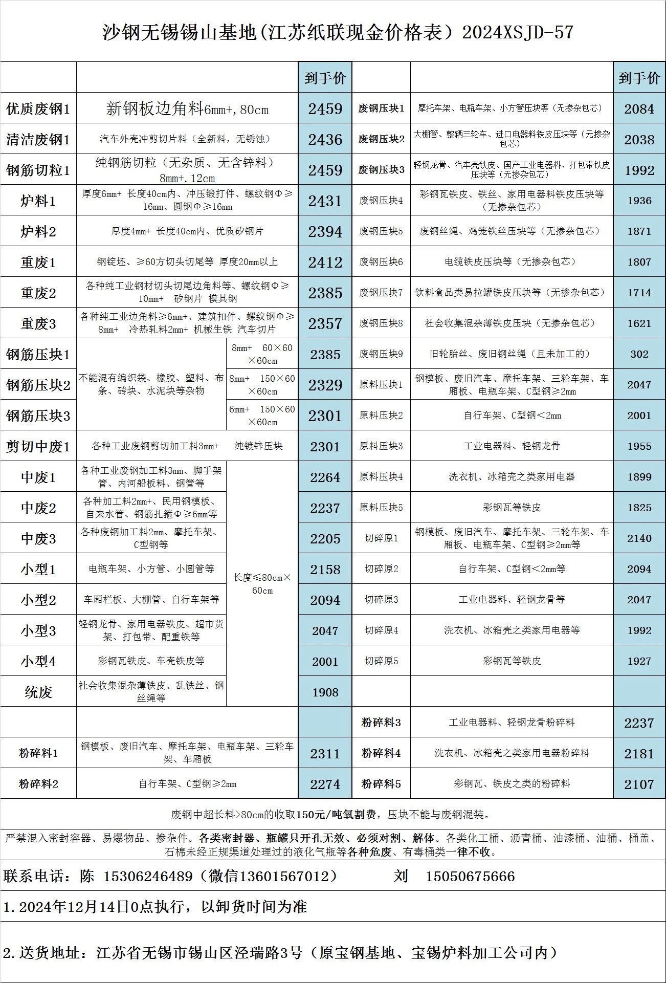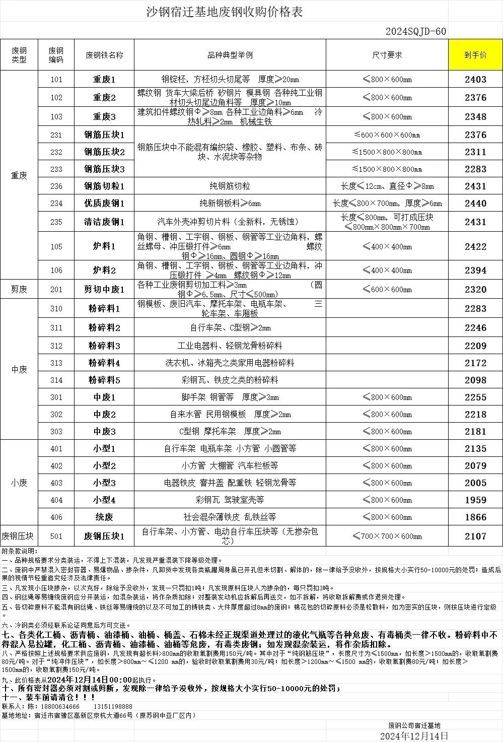 价格表更新!沙钢宿迁基地自****年**月**日早*点起废钢含税价格下调**元/吨,具体废钢价格以基地价格表为准。
