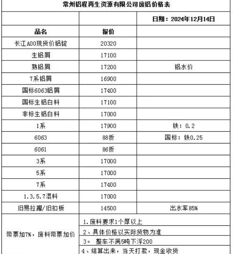 ****年**月**日常州铝程再生资源有限公司废铝价格表