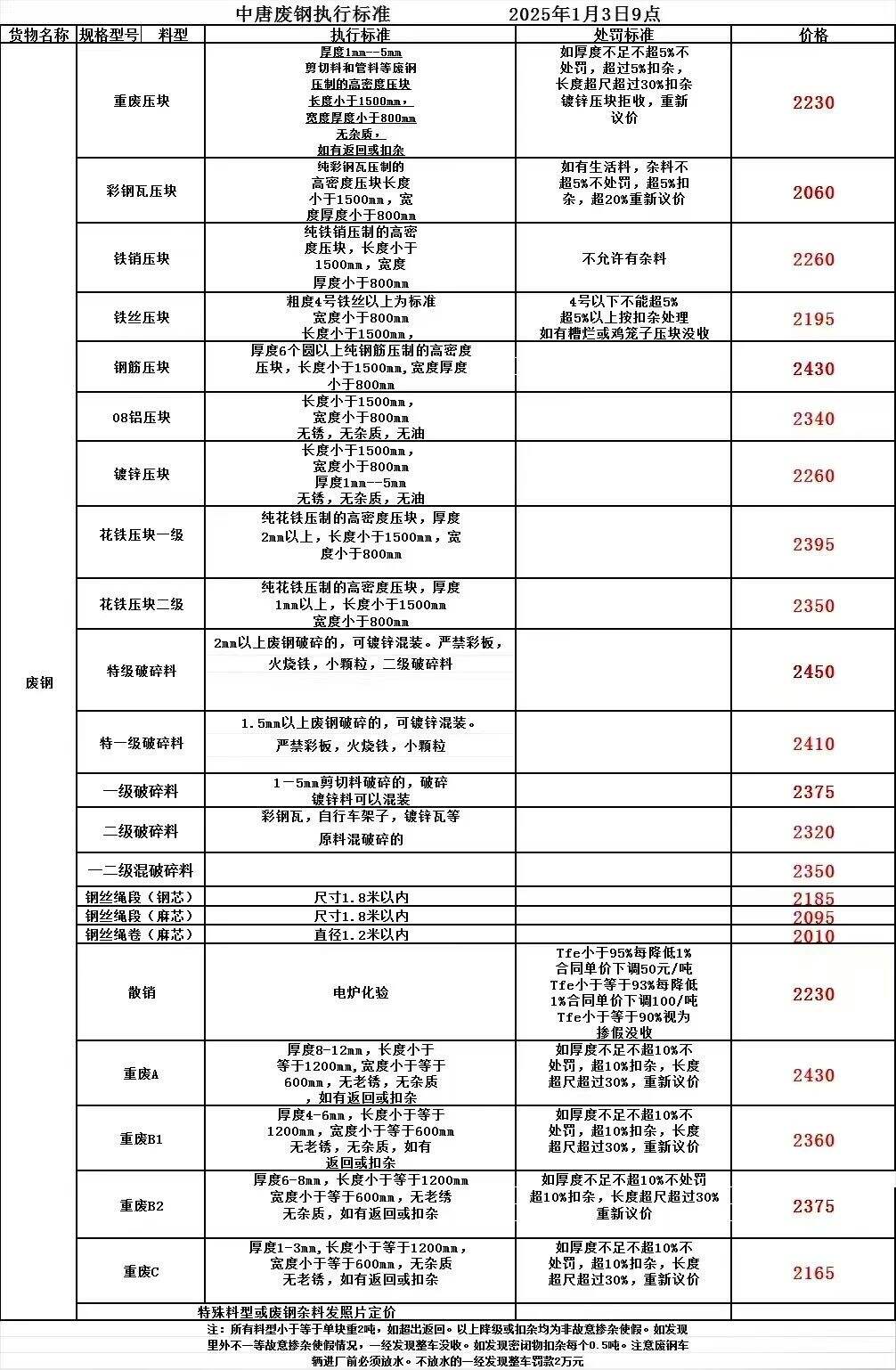 *月**日赤峰中唐废钢采购价格下调**,调后:重废压块****,彩钢瓦压块****,铁销压块****,镀锌压块****,花铁压块一级****,花铁压块二级****,一级破碎料****,二级破碎料****钢丝绳卷(麻芯)****,不含税。