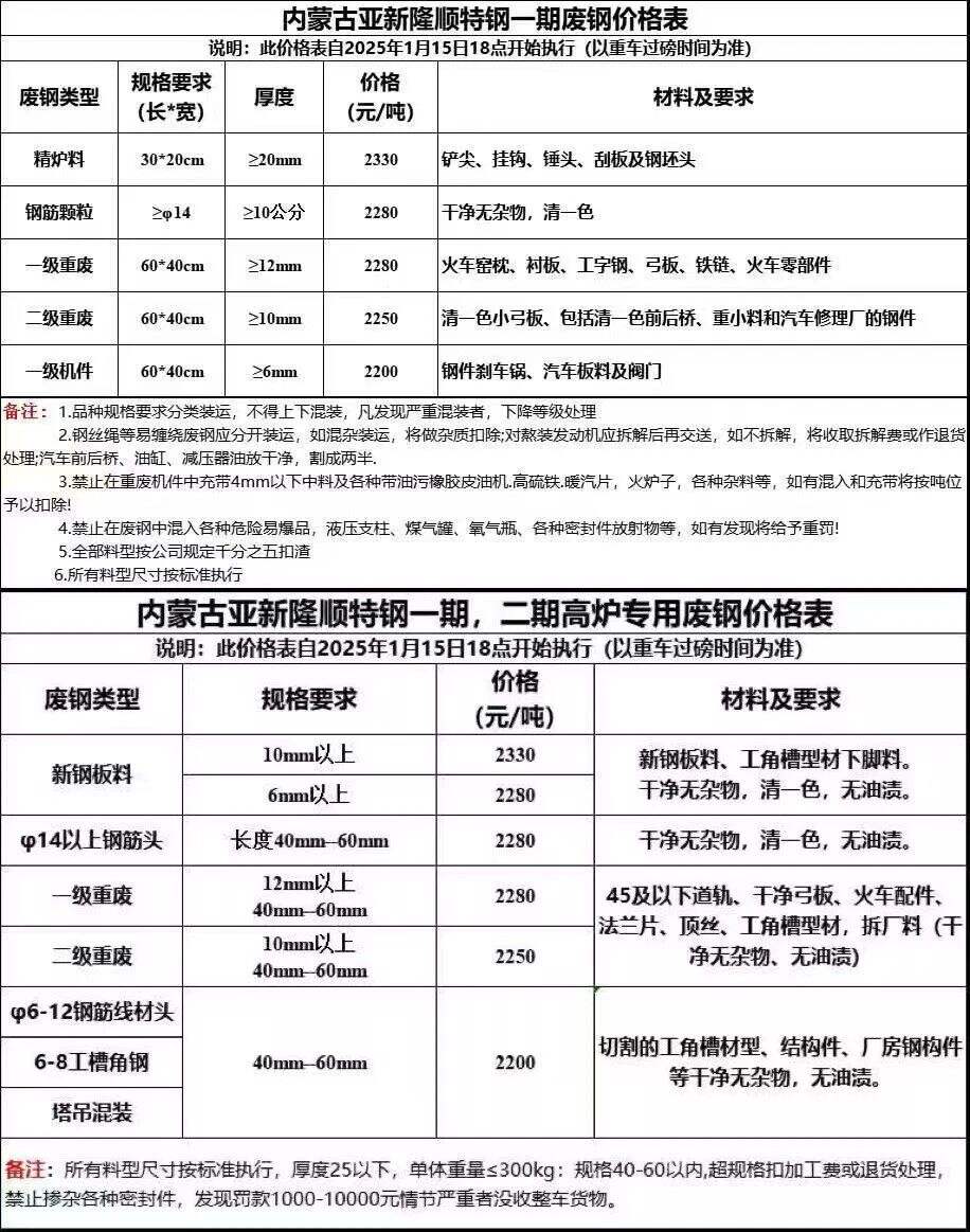 内蒙古亚新钢铁所有废钢采购价格下调**元/吨