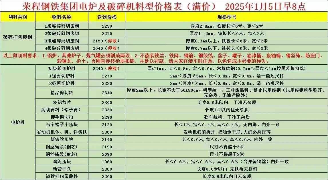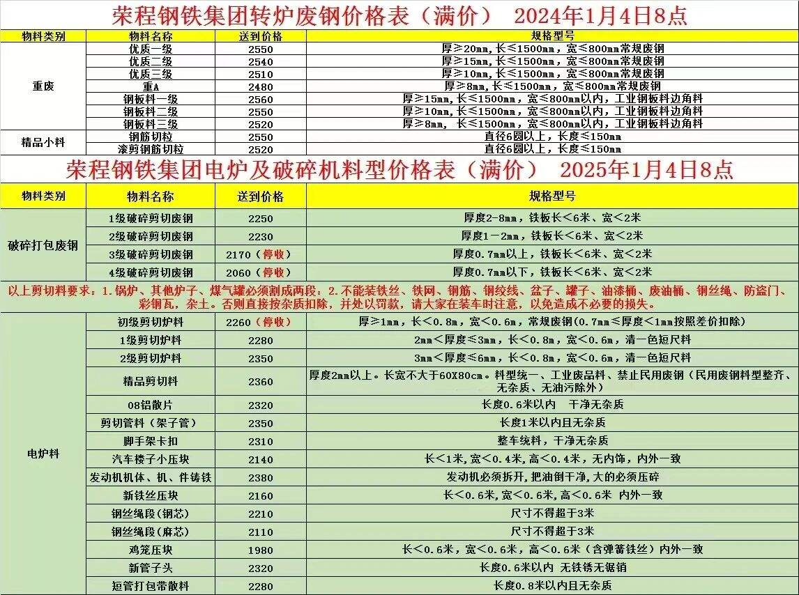 *月*日天津荣钢最新,*级破碎剪切废钢:****,*级破碎剪切废钢:****,*级破碎剪切废钢:****(停收),*级破碎剪切废钢:****(停收)初级剪切炉料:****(停收),*级剪切炉料:****,*级剪切炉料:****,精品剪切料:****:**铝散片:****,剪切管料(架子管):****,脚手架卡扣:****,汽车楼子小压块:****,发动机机体、机、件铸铁:****,新铁丝压块:****,钢丝绳段(钢芯):****,钢丝绳段(麻芯):****,鸡笼压块:****,新管子头:****,短管打包带散料:****