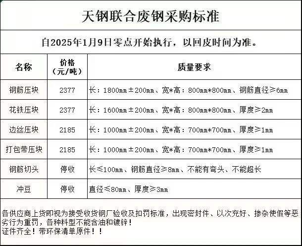 天钢联合自*月*日零点起,钢筋压块****,花铁压块****,边丝压块****,打包带压块****,钢筋切头停收,冲豆停收