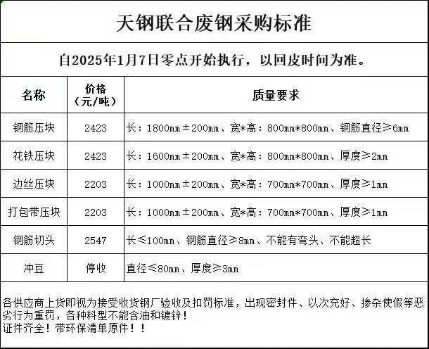 天钢联合通知,废钢下调**-**!具体价格以厂家价格表为准,天钢联合自*月*日零点起,钢筋压块****,花铁压块****,边丝压块****,打包带压块****,钢筋切头****,冲豆停收