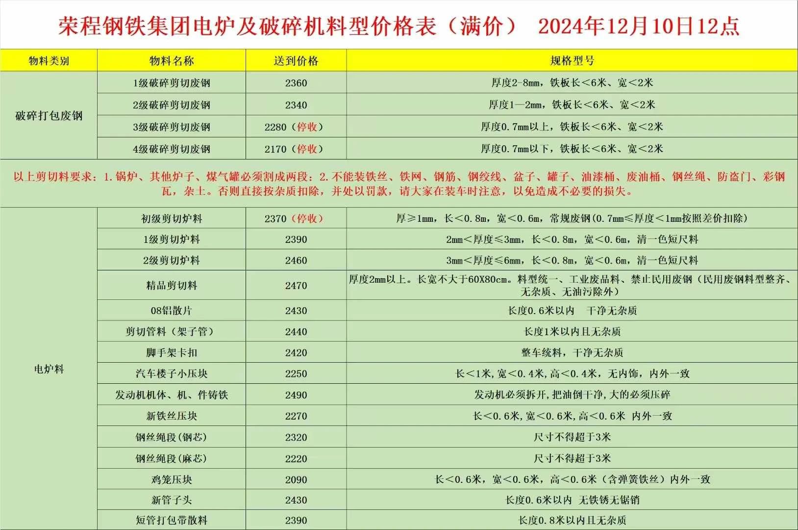 **月**日天津荣钢最新,优质一级****,优质二级****,优质三级****,重A****,钢板料一级****,钢板料二级****,钢板料三级****,钢筋切粒****,滚剪钢筋切粒****,*级破碎剪切废钢****,*级破碎剪切废钢****,*级破碎剪切废钢****(停收),*级破碎剪切废钢****(停收),初级剪切炉料****(停收),*级剪切炉料****,*级剪切炉料****,精品剪切料****:**铝散片****,剪切管料(架子管)****,脚手架卡扣****,汽车楼子小压块****,发动机机体、机、件铸铁****,新铁丝压块****,钢丝绳段(钢芯)****,钢丝绳段(麻芯)****,鸡笼压块****,新管子头****,短管打包带散料****