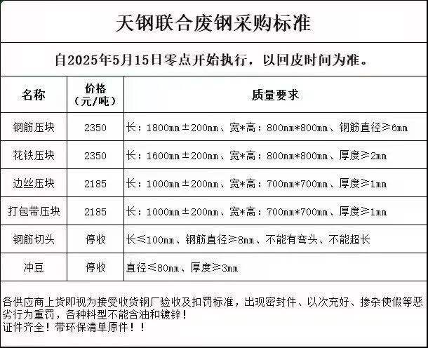 天钢联合*月**日开始执行,钢筋压块****,花铁压块****,边丝压块****,打包带压块****,钢筋切头停收,冲豆停收