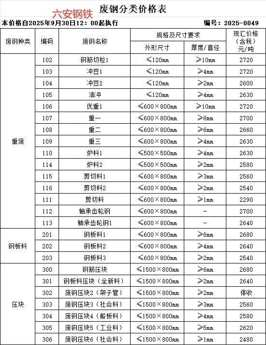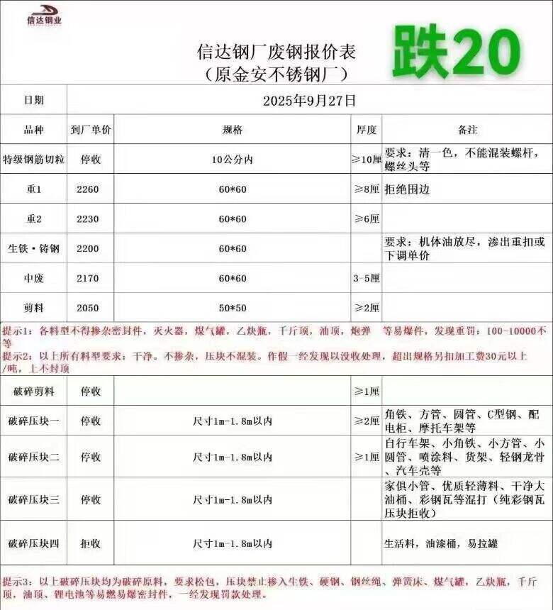**日六安信达最新价跌**:钢筋切粒停收重一****重二****生铁铸钢****中废****剪料****破碎剪料停收破碎压块一停收破碎压块二停收