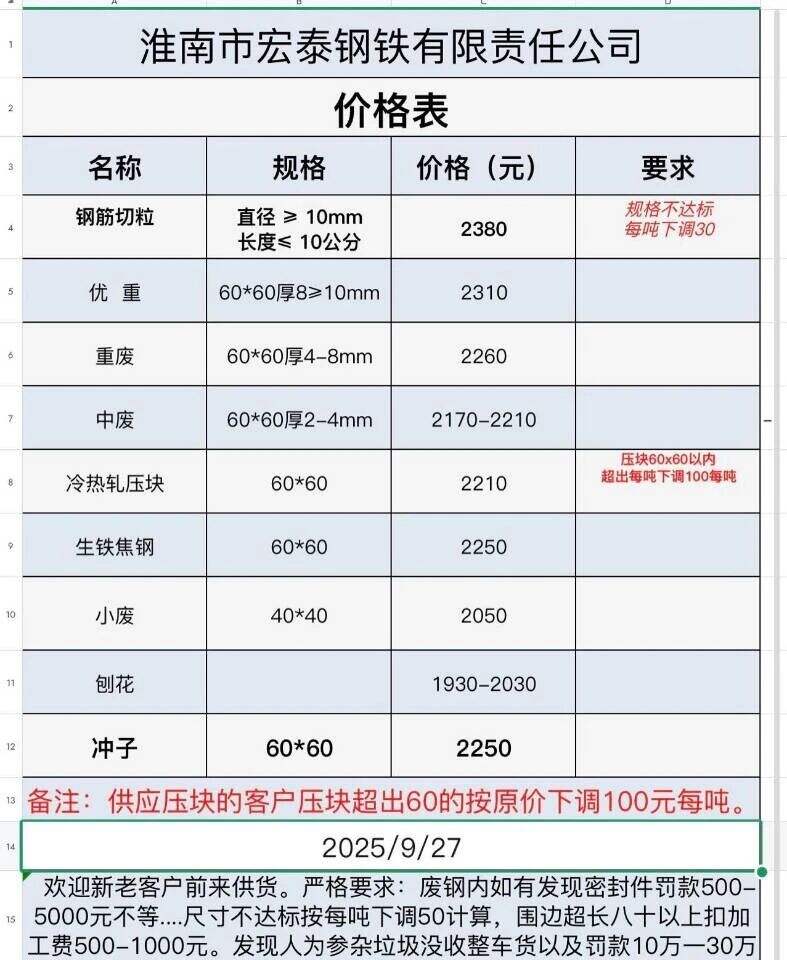 **日淮南宏泰废钢跌**:钢筋切粒****,优重****,重废****,中废****-****,冷热轧压块****,生铁焦钢****,小废****,刨花****-****,冲子****