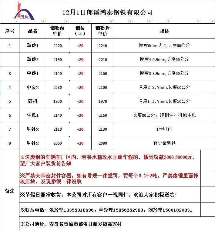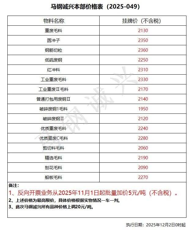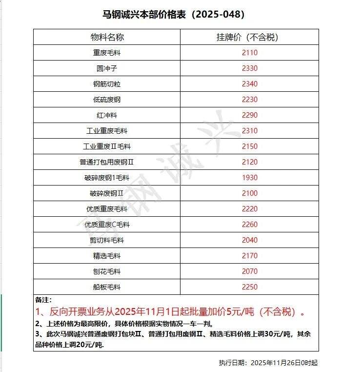 **月*日起,马钢诚兴本部废钢价格上调**元/吨,调整后:重废毛料最高****元/吨,圆冲子最高****元/吨,钢筋切粒最高****元/吨,低硫废钢最高****元/吨,红冲料最高****元/吨,工业重废毛料最高****元/吨,工业重废Ⅱ毛料最高****元/吨,普通打包用废钢Ⅱ最高****元/吨,破碎废钢*毛料最高****元/吨,破碎废钢Ⅱ最高****元/吨,优质重废毛料最高****元/吨,优质重废C毛料最高****元/吨,剪切料毛料最高****元/吨,精选毛料最高****元/吨,刨花毛料最高****元/吨,船板毛料最高****元/吨。以上价格不含税。