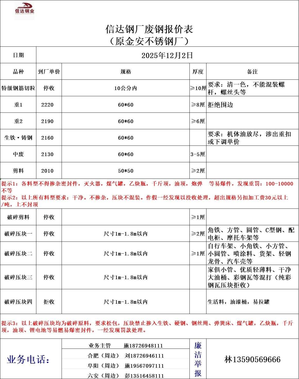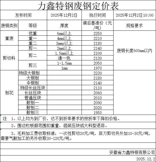 **日安徽力鑫特钢收购价涨**:重废****-****,剪料****-****,刨花****-****具体参考报价单,不含税。