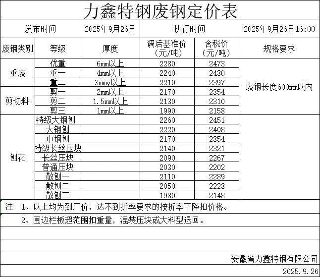 **日安徽力鑫特钢收购价涨**-**,重废****-****,剪料****-****,刨花****-****具体参考报价单,不含税。
