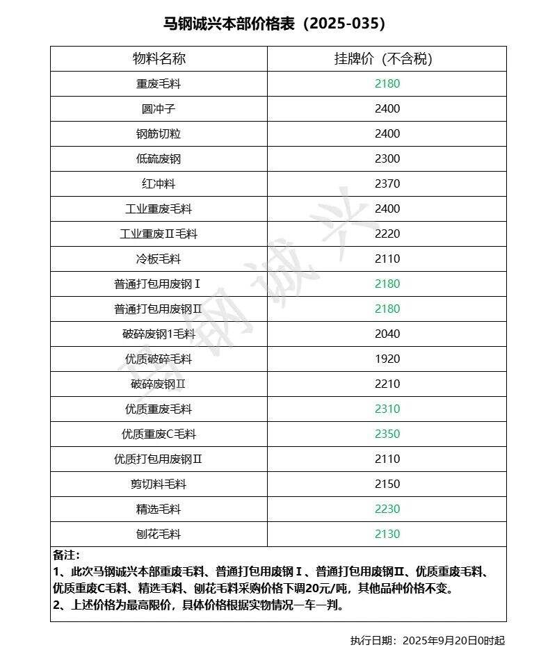 *月**日起,马钢诚兴本部破碎废钢*毛料和破碎废钢Ⅱ价格下调**元/吨,其他品种价格不变,调整后: