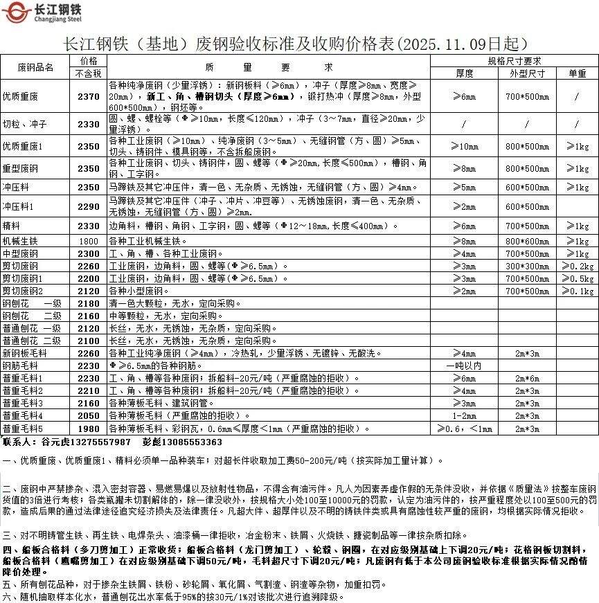 长江钢铁马钢利华基地自**月*日起对废钢价格下调**-**元/吨,具体价格见下表