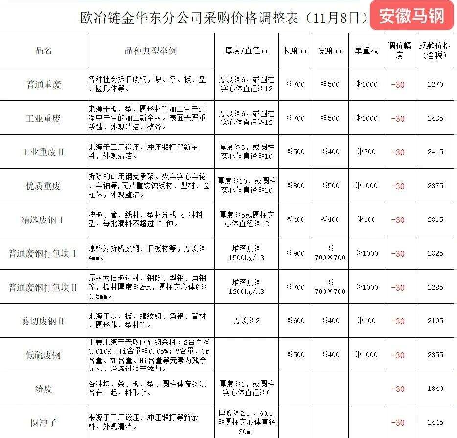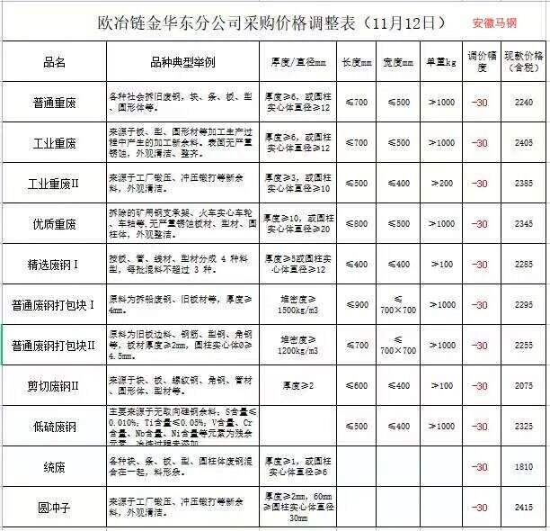 **月**日起,马钢诚兴本部所有品种废钢价格下调**元/吨,调整后:重废毛料最高****元/吨,圆冲子最高****元/吨,钢筋切粒最高****元/吨,低硫废钢最高****元/吨,红冲料最高****元/吨,工业重废毛料最高****元/吨,工业重废Ⅱ毛料最高****元/吨,普通打包用废钢Ⅱ最高****元/吨,破碎废钢*毛料最高****元/吨,破碎废钢Ⅱ最高****元/吨,优质重废毛料最高****元/吨,优质重废C毛料最高****元/吨,剪切料毛料最高****元/吨,精选毛料最高****元/吨,刨花毛料最高****元/吨,船板毛料最高****元/吨,以上价格不含税。