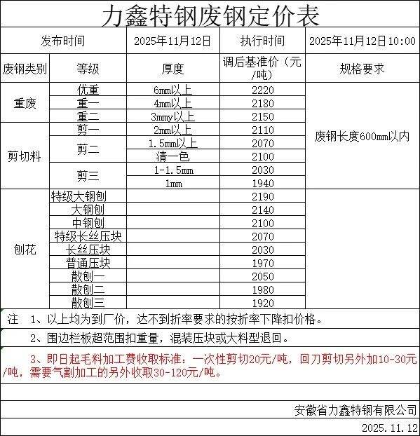 **日安徽力鑫特钢收购价跌**:重废****-****,剪料****-****,刨花****-****具体参考报价单,不含税。