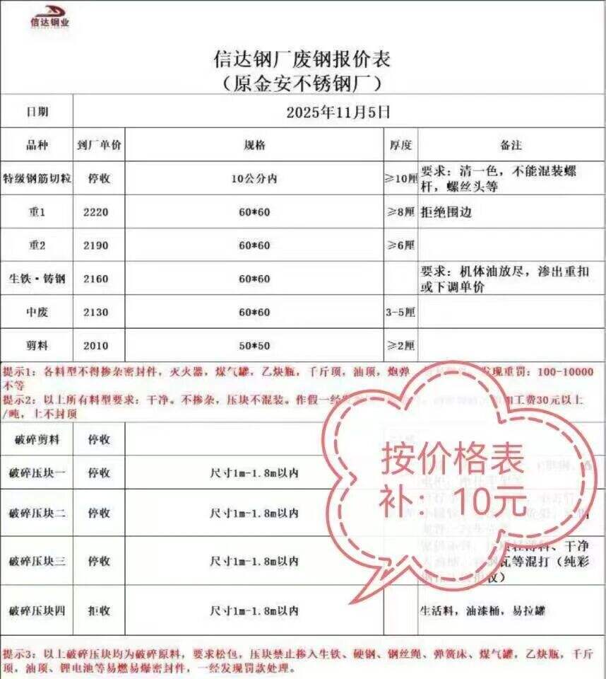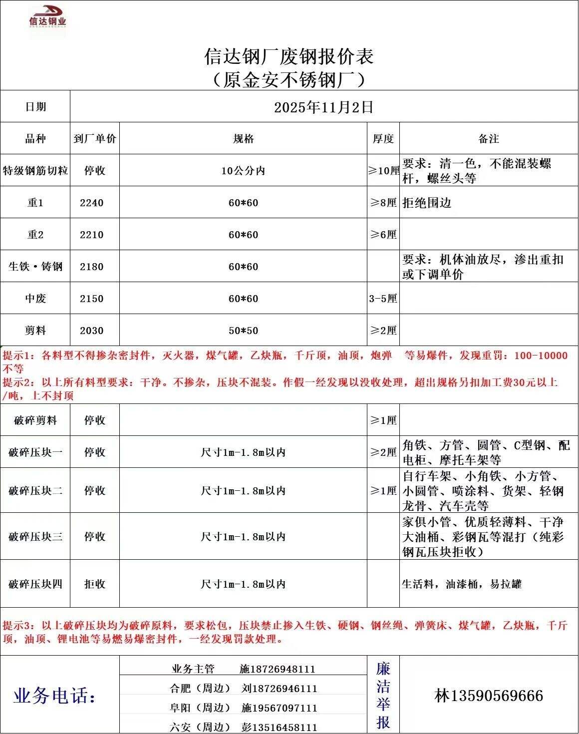 *日六安信达废钢跌**:钢筋切粒停收,重一****重二****生铁铸钢****中废****剪料****破碎剪料停收破碎压块一停收。