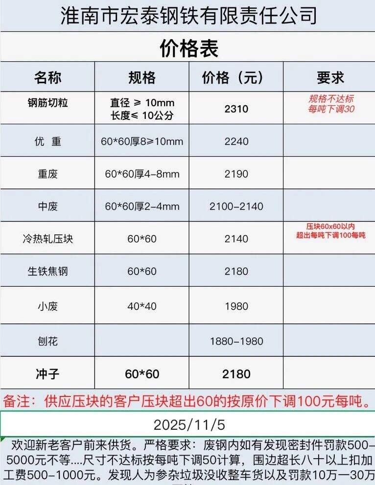 *日淮南宏泰废钢跌**:钢筋切粒****,优重****重废****,中废****-****,冷热轧压块****,生铁焦钢****,小废****刨花****-****冲子****,不含税。