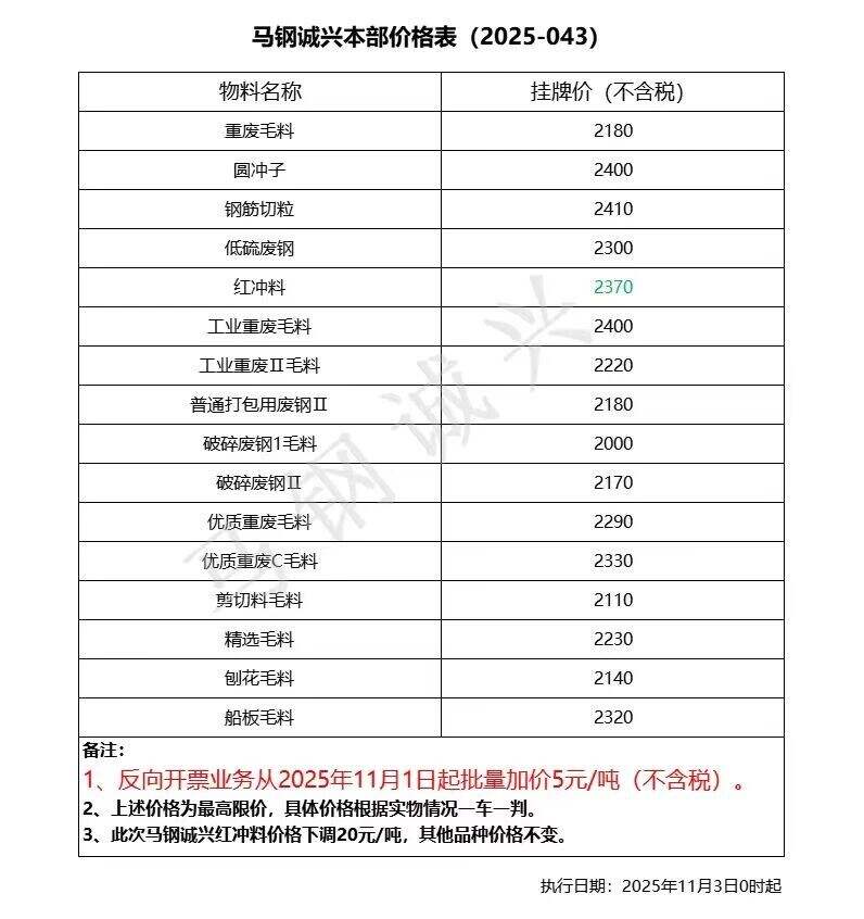 **月*日起,马钢诚兴红冲料价格下调**元/吨,工业重废毛料和普通打包用废钢Ⅱ价格下调**元/吨,其他品种价格不变,调整后: