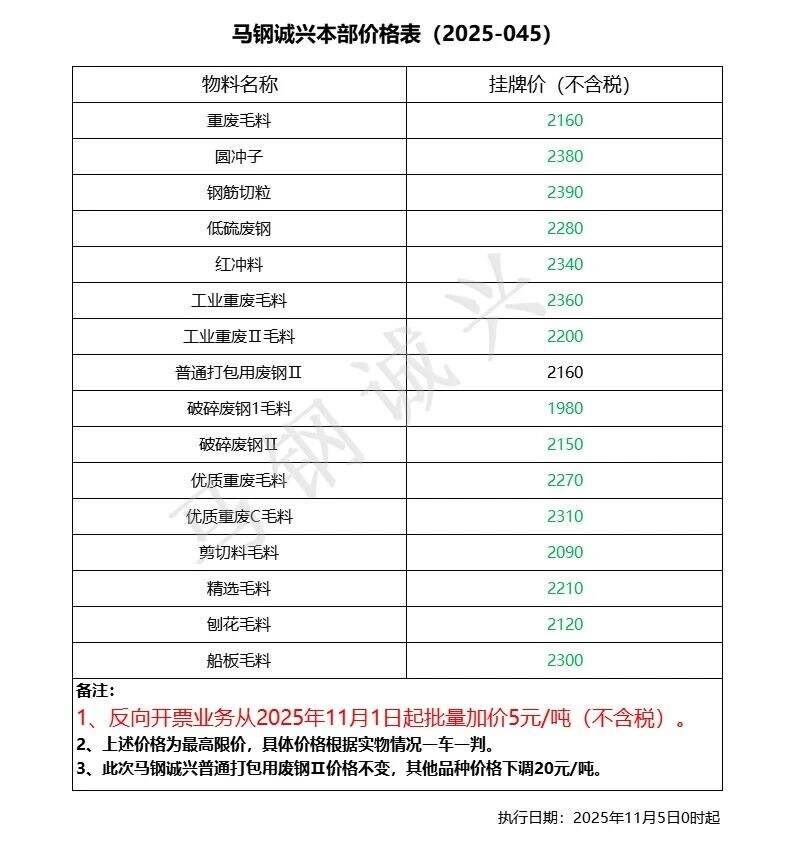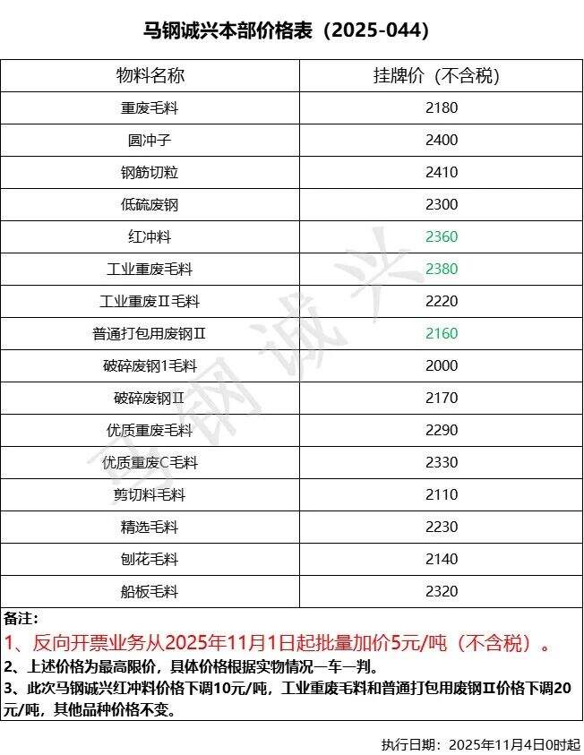 **月*日起,马钢诚兴本部部分品种废钢价格下调**元/吨,调整后:重废毛料最高****元/吨,圆冲子最高****元/吨,钢筋切粒最高****元/吨,低硫废钢最高****元/吨,红冲料最高****元/吨,工业重废毛料最高****元/吨,工业重废Ⅱ毛料最高****元/吨,普通打包用废钢Ⅱ最高****元/吨,破碎废钢*毛料最高****元/吨,破碎废钢Ⅱ最高****元/吨,优质重废毛料最高****元/吨,优质重废C毛料最高****元/吨,剪切料毛料最高****元/吨,精选毛料最高****元/吨,刨花毛料最高****元/吨,船板毛料最高****元/吨,以上价格不含税。