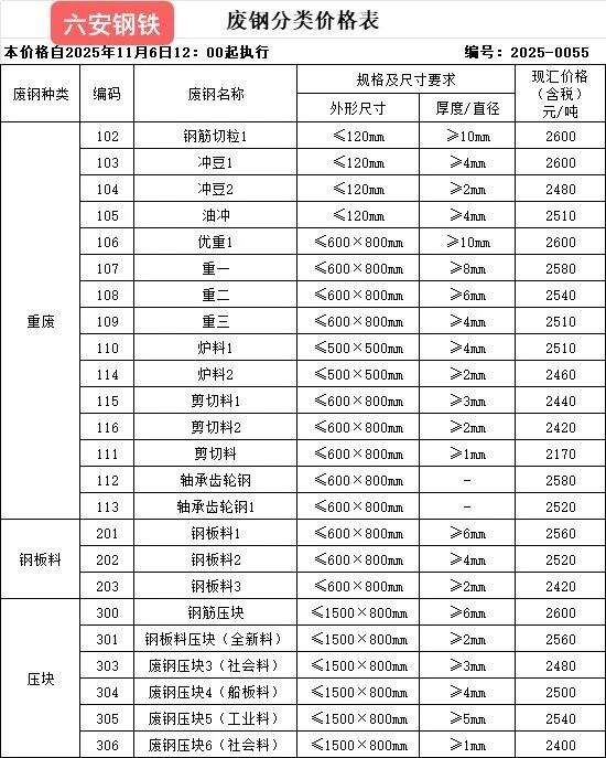 六安钢铁通知:**月*日*点起重废类降**元、压块类降**元,价格表明天补发。