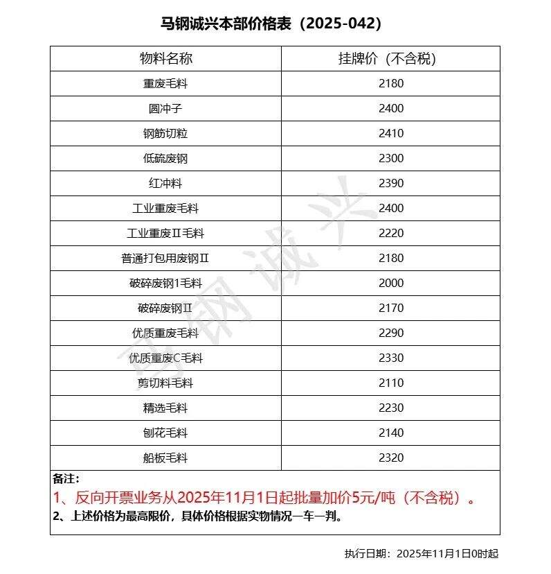 马钢诚兴反向开票业务从****年**月*日起批量加价*元/吨(不含税)