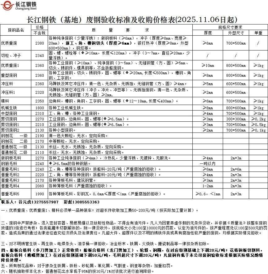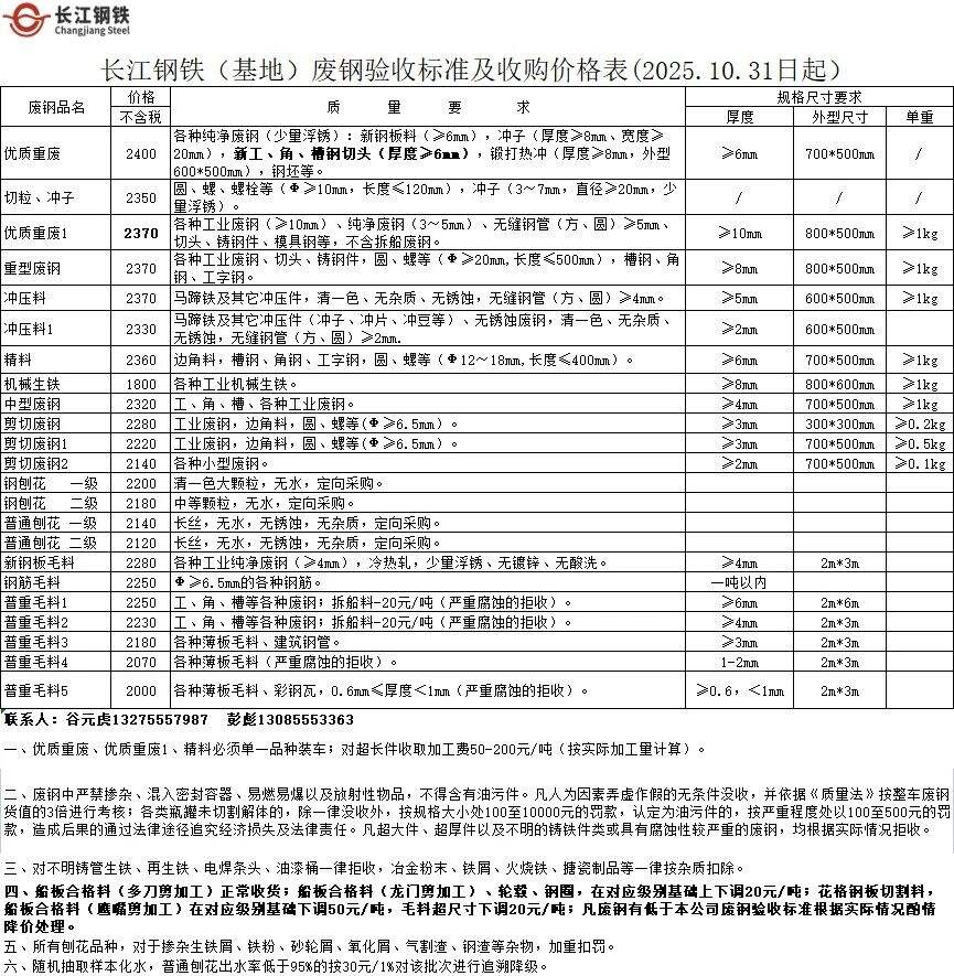 **日长江钢铁马钢利华基地废钢优一下调**元/吨。优重****,切粒、冲子****,优质重废*:****,重型废钢****,冲压料****,冲压料*:****,精料****,机械生铁****中型废钢****,剪切废钢****-****,钢刨花****-****。