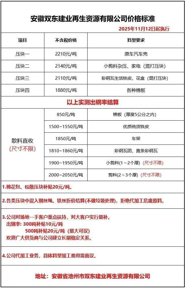 **月**日安徽双东建业再生资源有限公司价格标准