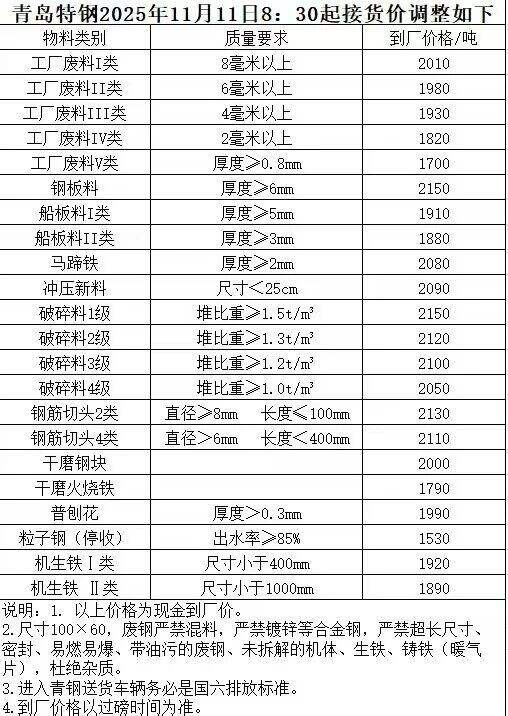 青岛特钢通知:各废钢供户,我司于****年**月**日*时**分起对外购普通废钢Ⅰ到Ⅴ类,船板料Ⅰ、Ⅱ类,机生铁Ⅰ、Ⅱ类下调**元/吨。