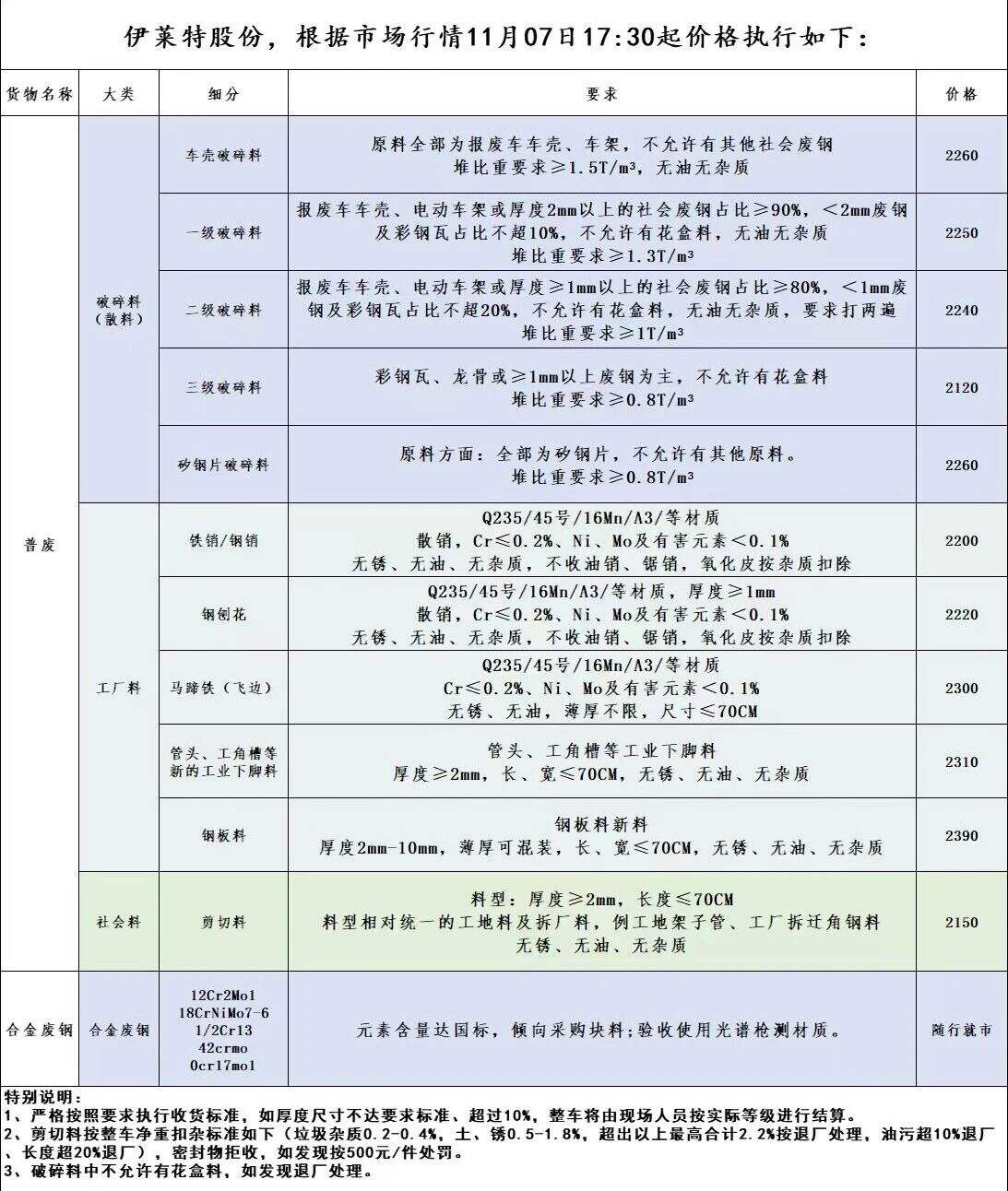 潍坊特钢废钢价格做出如下调整:不开票散户----------重型废钢:****元/吨,特级废钢:****元/吨,中级废钢:****元/吨(停收)*%增值税专用发票----重型废钢:****元/吨,特级废钢:****元/吨,中级废钢:****元/吨**%增值税专用发票---重型废钢:****元/吨,特级废钢:****元/吨,中级废钢:****元/吨废钢个人户----------重型废钢:****元/吨,特级废钢:****元/吨,中级废钢:****元/吨以上规格及价格自****年**月**日早上*点开始执行。