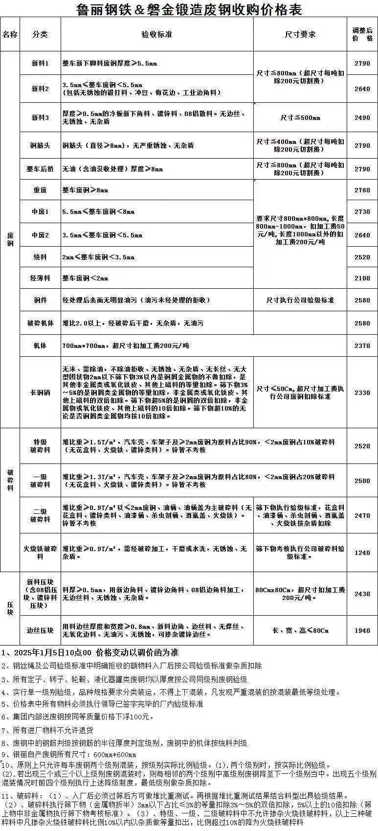 鲁丽,****年*月*日**:**,*、合金炉返回料暂不做调整,*、公司外采废钢价格下调**,*、基地废钢同步下调**,*、协议类,纸业废纸钉暂不调整,其余协议类下调**,新料一****,新料二****新料三****钢筋头****,重废****,中废****-****统料****特级破碎料****一级破碎****二级破碎****边丝压块****,火烧铁破碎料****不含税