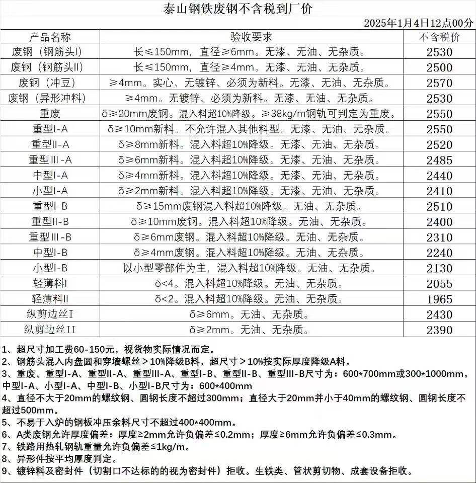 泰山钢铁自*月*日起,不含税指导价,废钢(钢筋头I)****,废钢((钢筋头II)****,废钢(冲豆)****,废钢(异形冲料)****,重废****,重型I-A****,重型II-A****,重型Ⅲ-A****,中型I-A****,小型I-A****,重型I-B****,重型II-B****,重型Ⅲ-B****,中型I-B****,小型I-B****,轻薄料I****,轻薄料Ⅱ****,纵剪边丝I****,纵剪边丝II****