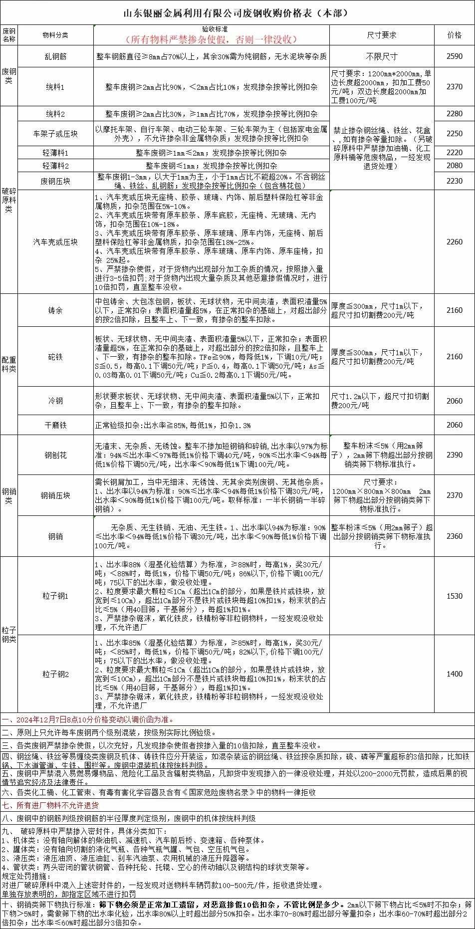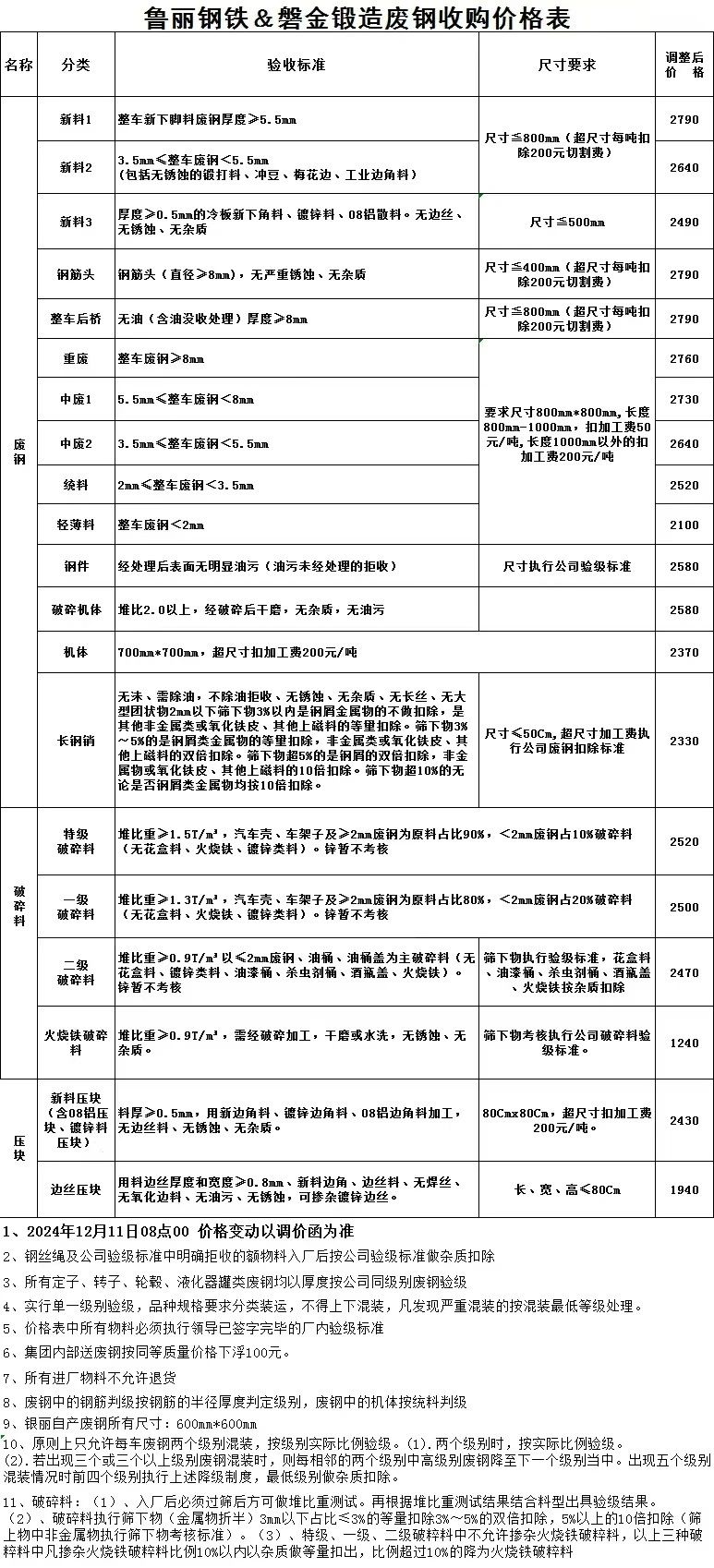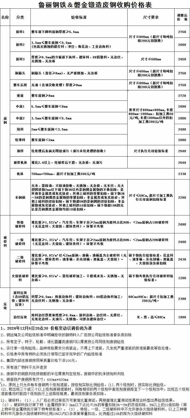 鲁丽,****年**月*日**:**,*、合金炉返回料暂不做调整,*、公司外采废钢价格下调**,*、基地废钢同步下调**,*、协议类,纸业废纸钉不做调整,其余协议类(含易鸿渣铁)下调***日山东鲁丽跌**,新料一****,新料二****新料三****钢筋头****,重废****,中废****-****统料****特级破碎料****一级破碎****二级破碎****边丝压块****,火烧铁破碎料****不含税