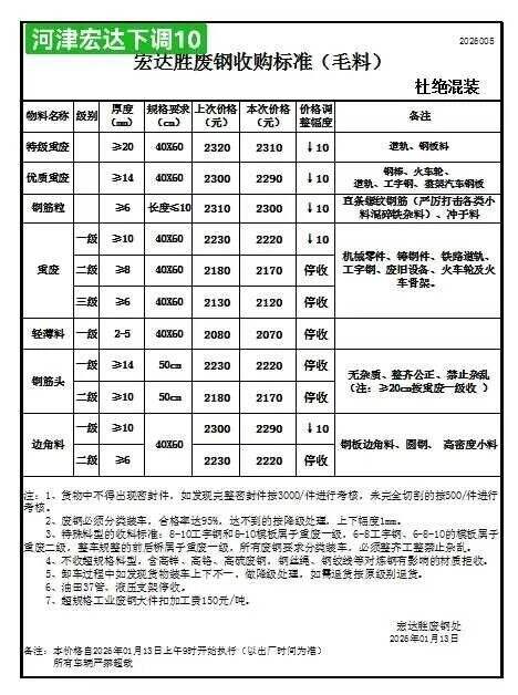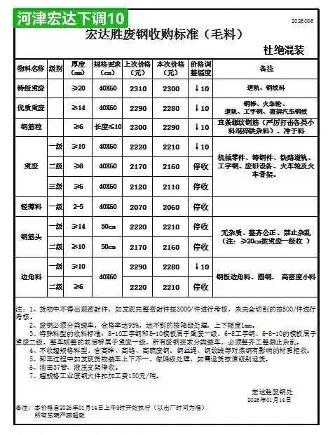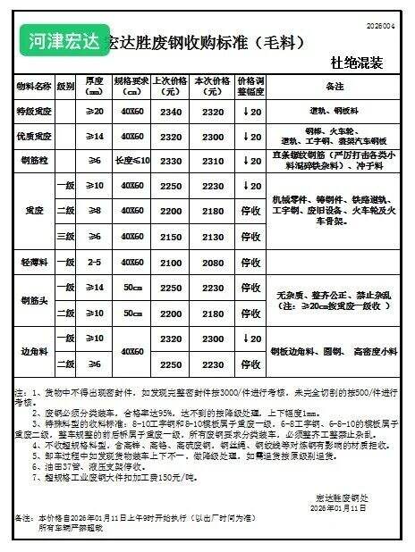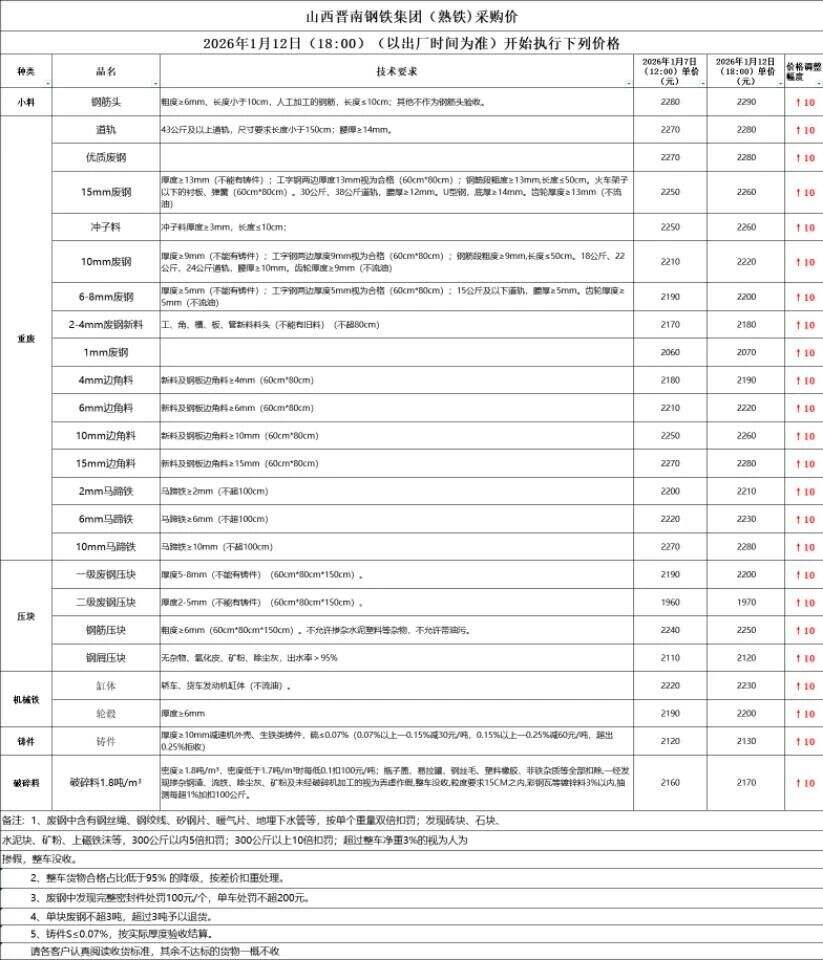 山西华鑫源钢铁集团通知:****年*月*日**时起,废钢各料型上调**执行以下价格: