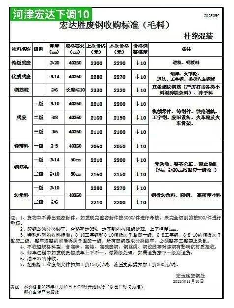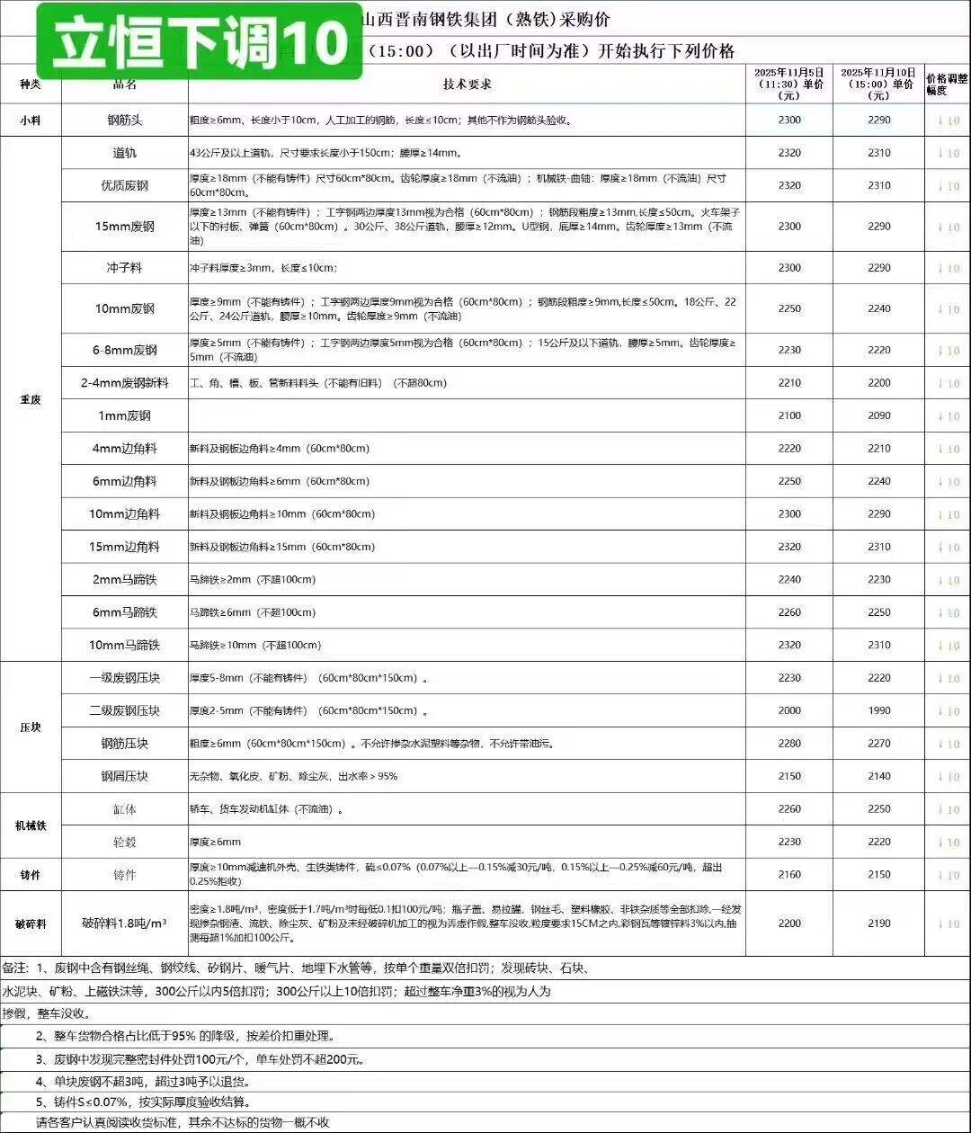 **月*日山西晋钢废钢下调**,重废二****,中废一****,中废二****,*-*厚轻废****,清一色**-**厚特级****,清一色*-**厚特级****,清一色*-*厚特级****,清一色模板****,清一色钢筋颗粒****,*-*厚钢筋压块****,*-**厚钢筋压块****,钢板压块****,模板压块****,不含税。
