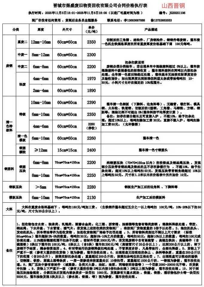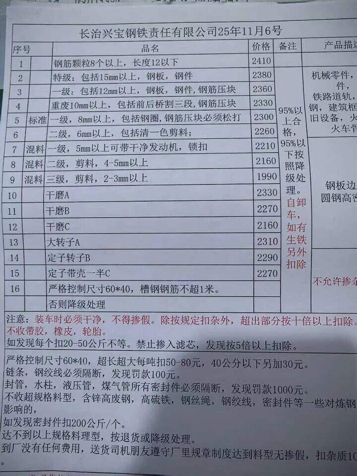 **日山西长治金烨跌**:一类钢板料****,二类钢板料****,一类钢筋颗粒****,钢筋段****,二类钢筋颗粒****,优质A****,优质B****重废A****,重废B****,一类钢筋压块****,二类钢筋压****,中废****,普废****,普废压块****,机械生铁****,一级剪料停收二级剪料停收彩钢瓦停收,不含税。